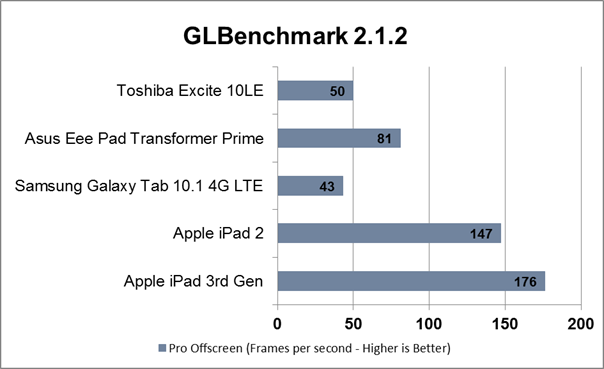 the iPad excelled at some metrics, as you can see in the GLBenchmark 2.1.2 charts below.